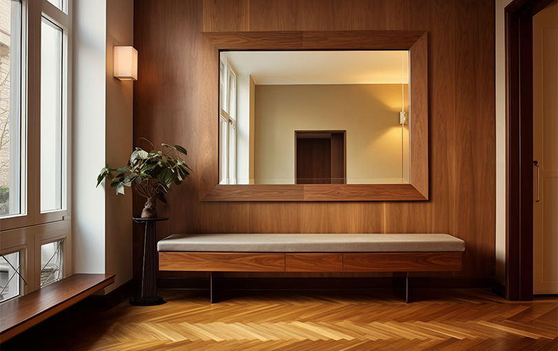 Corredores e halls de entrada costumam ser espaços estreitos e pouco iluminados. Por isso, são locais ideais para o uso estratégico de espelhos.
